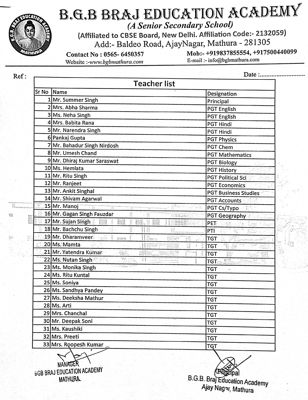 B.G.B Braj Education Academy Senior Secondary School Ajay Nagar , Baldeo Road, Near Thana, Yamunna Par Mathura - (U.P) Phone No: +91-8923346580, 8923881035, 9837855554 Email : bgb.ajaynagar@gmail.com Website:www.bgbmathura.com